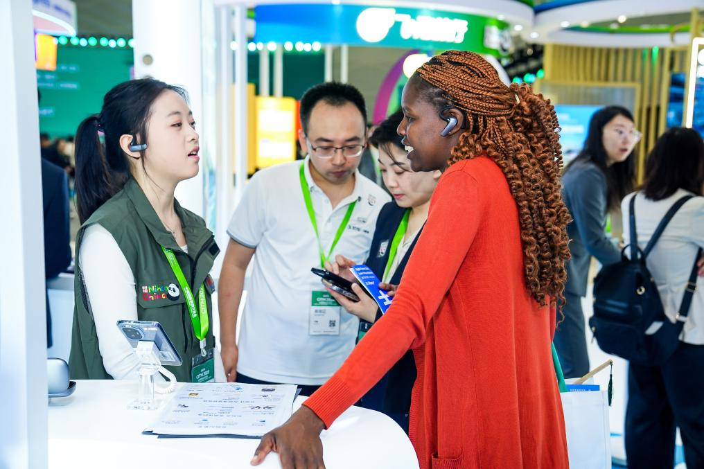在海口举办的2025中国国际旅游交易会上,海外客商体验讯飞AI翻译耳机。 新华社发
